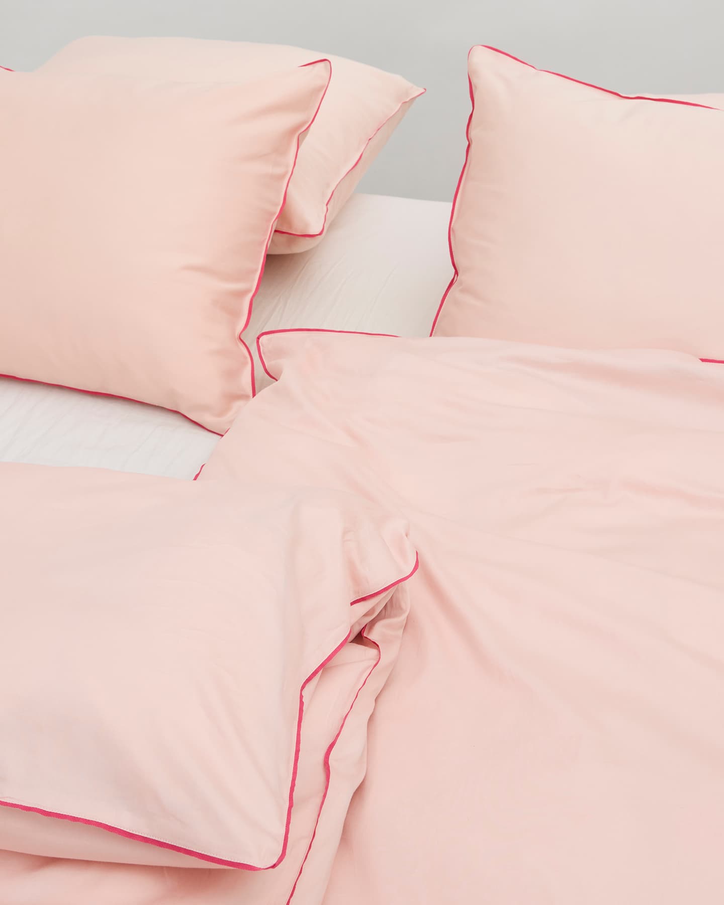 Strimmassa on ohut cerisen-värinen tere, joka menee pussilakanan ja tyynyliinan ympäri, ja on käsinommeltu kokeneilta räätäleiltä. Tere on tehty kierrätetystä polyesteristä. Satiininen kangas antaa pehmeän ja joustavan tunteen kauniilla kiillolla.