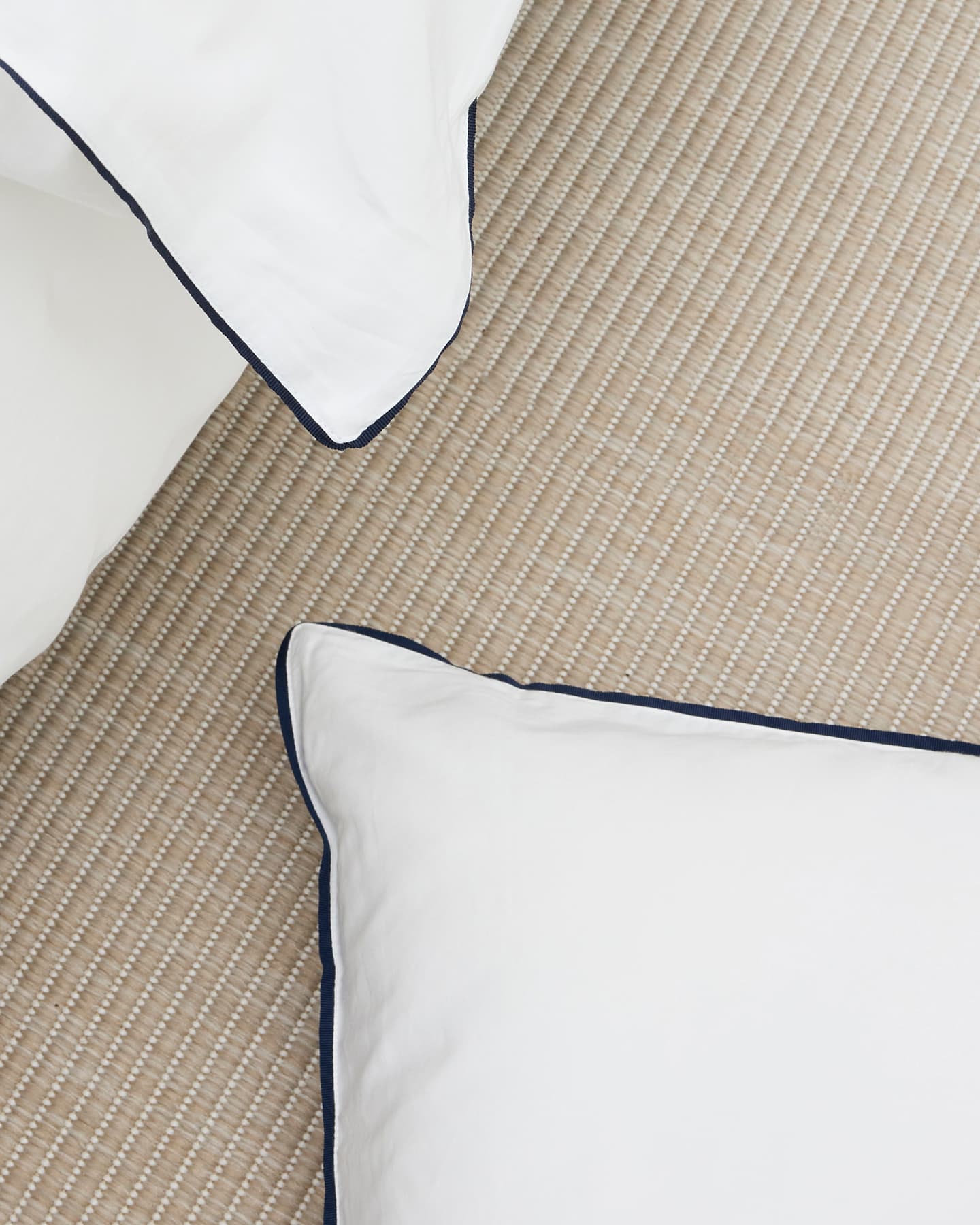 Strimmassa on ohut laivastonsininen tere, joka menee pussilakanan ja tyynyliinan ympäri, ja on käsinommeltu kokeneilta räätäleiltä. Tere on tehty kierrätetystä polyesteristä. Satiininen kangas antaa pehmeän ja joustavan tunteen kauniilla kiillolla.